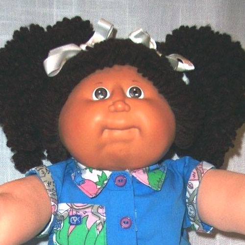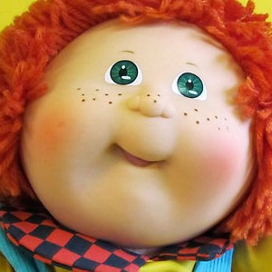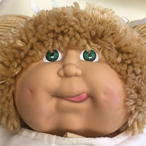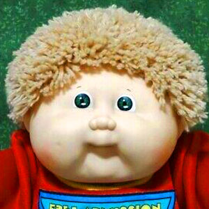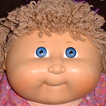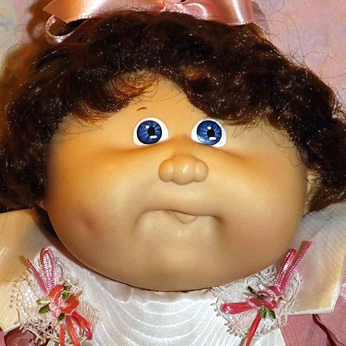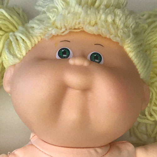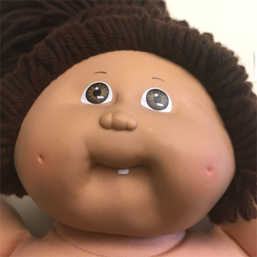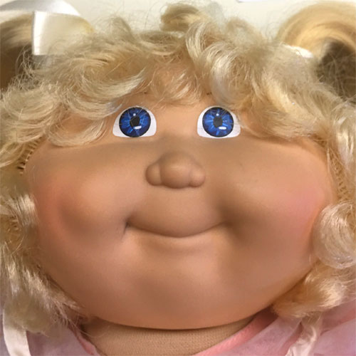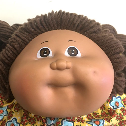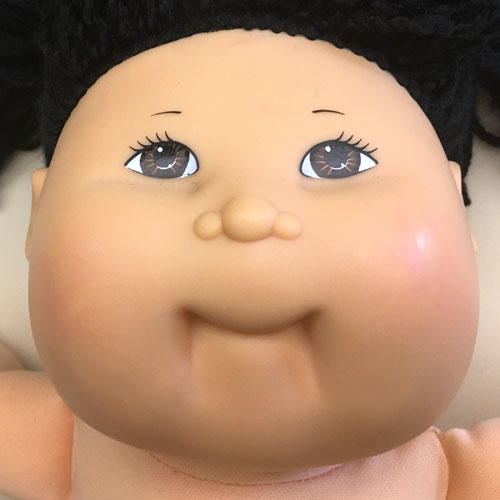 The most common Cabbage Patch doll face when first released in 1983, featuring large eyes, a long nose, and dimples on both cheeks. Freckles were common on this head mold.